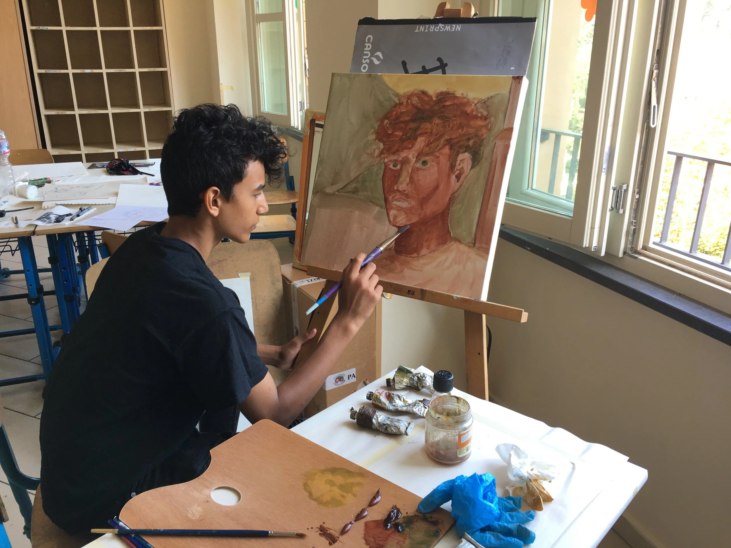 This week visual art students are focused on one of their major projects, the development of their self-portrait drawings and how they see themselves situated in Spoleto. Working in their medium of choice, they are considering composition, personal character, the use of color and it’s meaning, depth of field, and issues of abstraction where appropriate. Raul is working on a realistic portrait using oil on canvas, Naomi is working with pastels for the first time and Orlinka is developing an abstract self-portrait using acrylics and then oils.